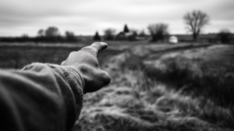 Behind him, a row of freshly cut tree stumps stretched toward the treeline, punctuated by orange survey stakes and the idle silhouettes of heavy machinery.